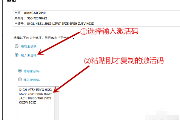 返回到cad的注册界面,点击【输入激活码】,然后把激活码粘贴在下方。