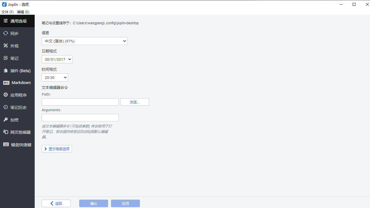 【如何在外部文本编辑器中编辑笔记?】编辑器命令(可能包含自变量)定义将使用哪个编辑器来打开注释。如果未提供,它将尝试自动检测默认编辑器。如果此操作不起作用,或者您想为Joplin进行更改,则需要在“首选项”->“文本编辑器”命令中对其进行配置。