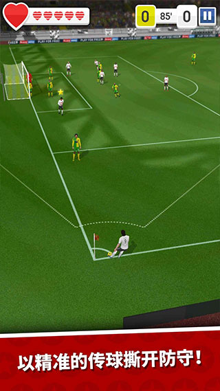 游戏的操作玩法比较简单,玩家通过滑动屏幕的方式传球或者射门。玩家需要在游戏屏幕左上方的生命槽耗尽之前将球送入球网即可,可供尝试的次数较多,但是想获得三星关卡通关的难度较大。