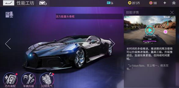 1、布加迪技能:技能名为三重推进,但使用的前提是氮气充满特技槽。效果上,可以提供长时间的多级推进,推进期间再次点击技能图标可升级推进强度,最高三级。升级推进后,对布加迪的加速效果更强,但持续时间也会更短;