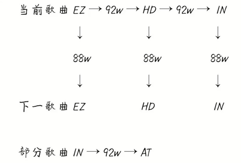 一种是把当前难度达到92w后开启下一难度,另一种是把上一首歌的对应难度达到88w后开启下一歌曲的对应难度,通俗点来说就是下图这样。
