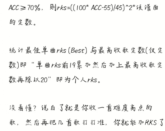 RKS根据你定数最高的19首歌曲的历史最高ACC和你所满分的难度最高的歌曲决定,因为取的是最高记录,所以RKS是不会降的(这点不同于Arcaea)计算公式详情请见下图。