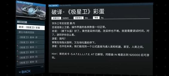 游玩かめりあ(极星卫)曲包内所有曲目任意难度,获取并观看文件破译·极星卫彩蛋,并将S.A.T.E.L.L.I.T.E.的IN难度达到920000以上可解锁S.A.T.E.L.L.I.T.E.的AT难度。