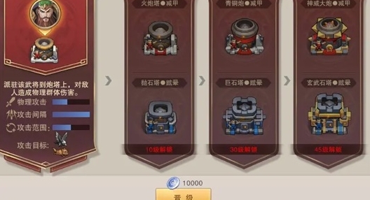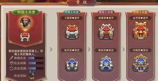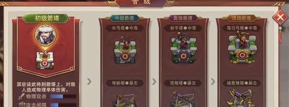 中级、高级、顶级箭塔分别在武将等级:10级、30级、45级时可以开启晋级。顾名思义,晋级后,攻击伤害和攻击范围也会随之上涨。