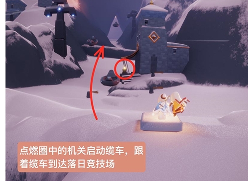 4、点亮下图中所示的机关,乘坐缆车前往落日竞技场,即可;