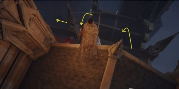 5、然后我们跳到下方的屋顶后向右前方走,可以看到一座塔楼。