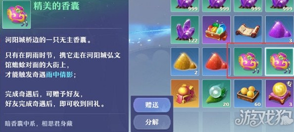 精致的香囊可以通过完成【落水之声】和【箱中女子】后,钓鱼小概率会获得,也可以让朋友赠送。