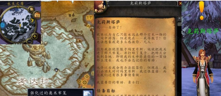 2、在北风苔原 首先我们前往北风苔原,在坐标位置:(33,33)找NPC克莉斯塔萨接取任务。接着任务要求我们使用奥术能量源引出莎拉苟萨并打败她。然后我们在背包点击强化过的奥术牢笼,召唤出NPC进行传送。