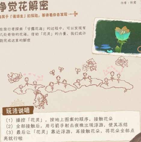 原神游戏高度自由开放,无限制约束,在这个国度尽情的去旅行,原神游戏版本不断的更新增加了很高的难度,在任务上有很多新的玩法,加入了很多的解谜玩法,很多玩家被解谜给难住了,原神净觉花怎么解密?这是很多玩家不知道的,原神中丰饶之海净觉花方法是按照地上的图案,操控花灵依次接触花朵即可,具体还是有很多的过程的,那么你不知道的话可以看下面的攻略,希望对你有帮助。