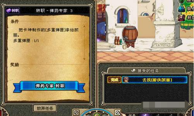 1、玩家Lv等级到达18级后,可在各职业的导师NPC处接取转职任务,如下图,弹药专家就找凯丽,要是鬼剑士找G.S.D,圣职者找歌兰蒂斯,暗夜使者找米内特,魔法师找莎兰,格斗家找风振,NPC头顶处会闪烁转职任务的标识。