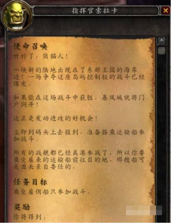 3、继续跟指挥官索拉卡对话,接“使命召唤”任务;注意:如果奥格瑞玛声望中立是接不到任务的。