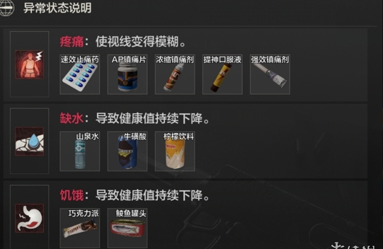 除此之外,还有恢复水量的各种饮料、恢复能量的各种食品、以及暂时免疫损坏负面状态的镇痛剂、止疼药等等,暗区先锋们也可以参考下图,查看部分常用药品和药品功能。