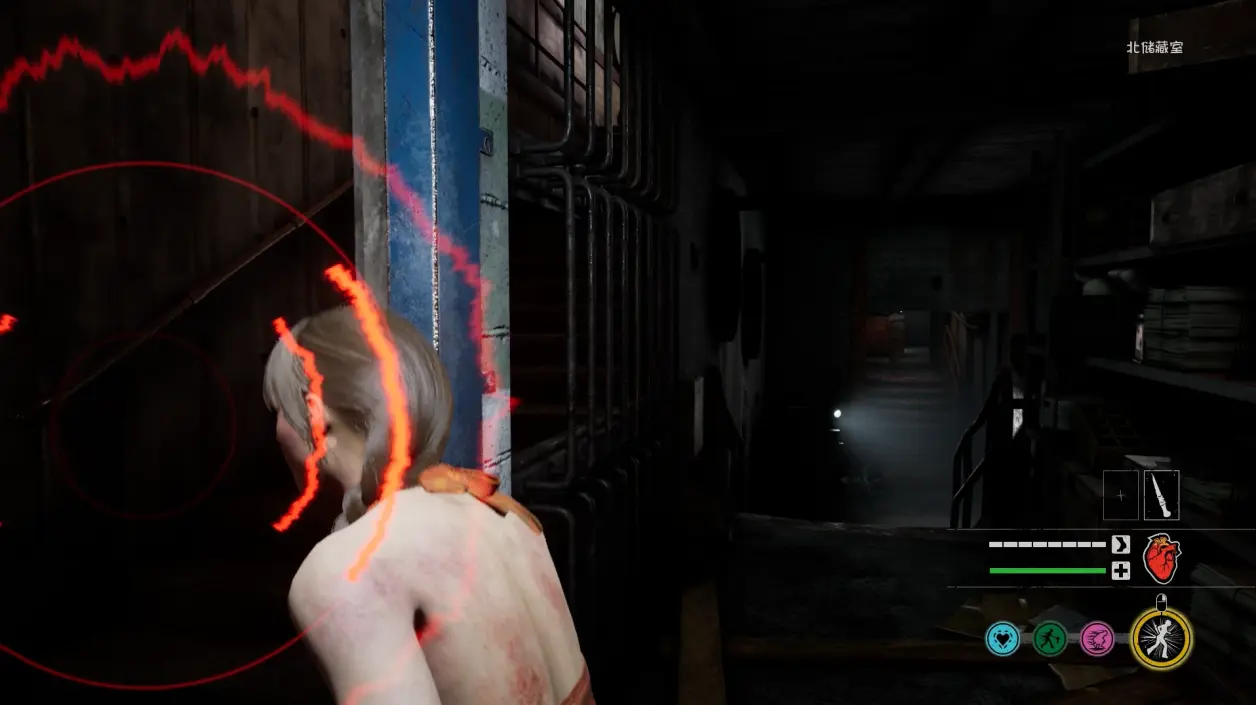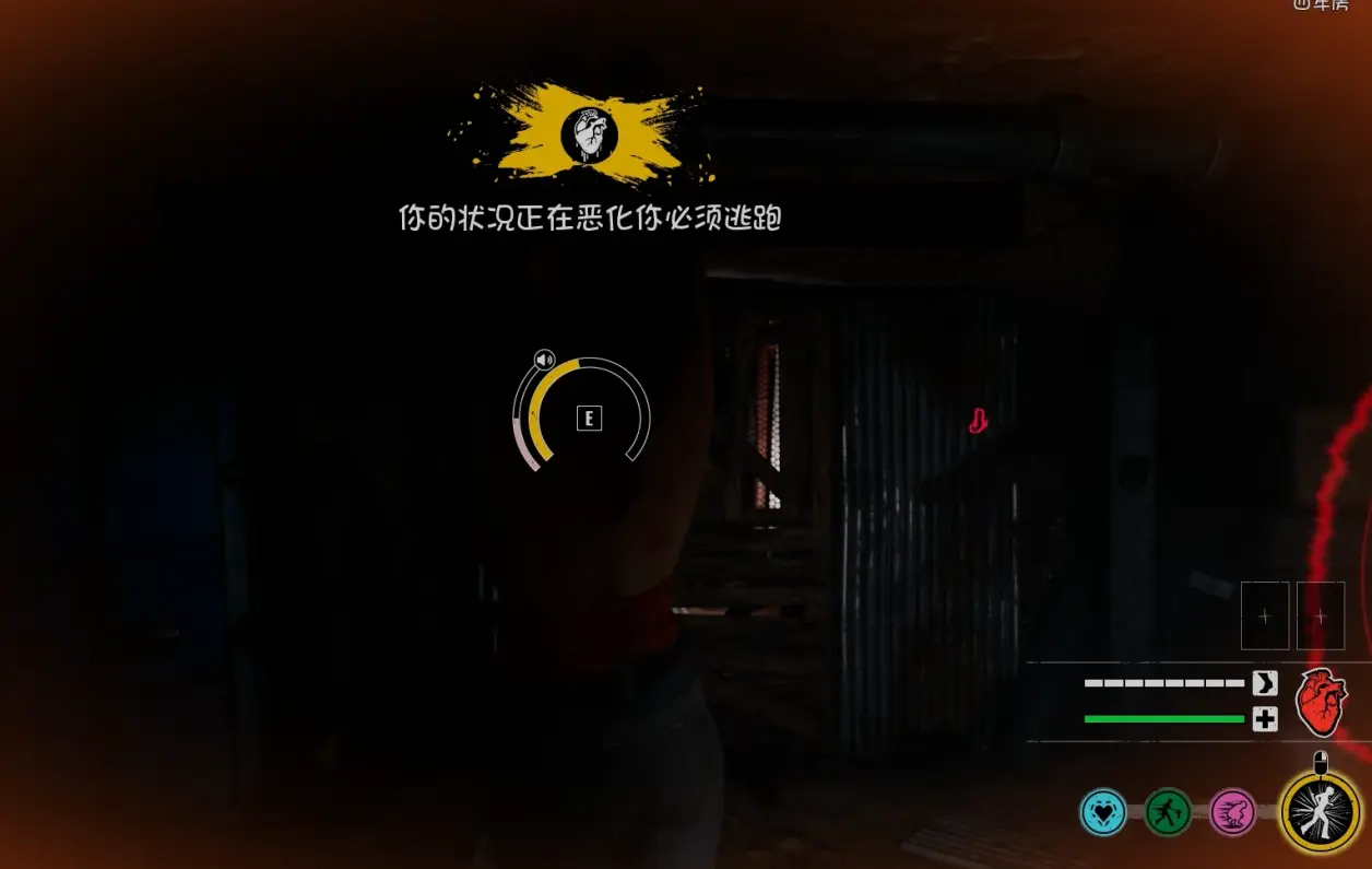 选择扮演“受害者”(还是称逃生者或人类吧,习惯点)进行游戏之后,伴随着过场动画,你会发现自己被吊起来了,这时候直接挣脱束缚,然后才是正式开始