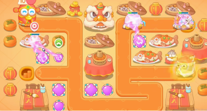 <新春厨艺秀>活动共有20个固定关卡和随机关卡,每次挑战的炮塔都会随机,有两次免费机会刷新,挑选出你喜欢的炮塔就可以开始挑战啦!充满兔兔年味的和财神装扮的阿波,在关卡等着你一起迎新年~