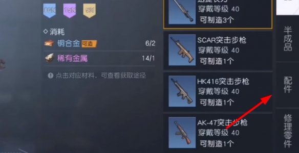 2、然后在右侧【配件】栏目中就能找到燃汽瓶。