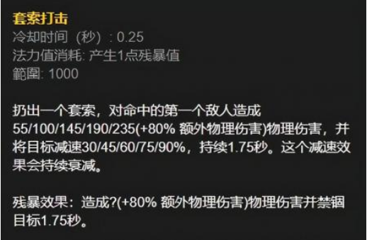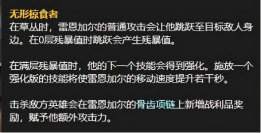 Q技能是一个单纯的单体伤害技能,可以用来刷新普攻,强化之后的效果是增加伤害,并附带一个持续五秒的攻速加成效果,这个技能是雷恩加尔的主要输出技能,在刷野和打架时都非常好用: