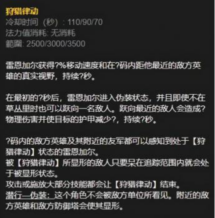 是R技能,R技能的主动效果是让狮子狗进入隐身并且增加移速,可以看到离你最近的敌方英雄的位置,下次攻击变成跳向敌方(与被动相同),造成额外物理伤害并减少敌方的护甲,这是狮子狗用来追击或逃跑的关键技能,移速与隐身在大多数场合都能起到作用,并且技能释放期间还可以给到对面后排很大压力感,是狮子狗用来切后排的技能: