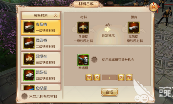 当玩家缺少相应材料时,可以使用低级材料合成高级材料。材料只能从上一级合成。玩家想要获得最高等级的材料只能一步步合成。材料合成可以批量进行。有些材料在合成过程中可能会失败。玩家可以添加幸运材料来增加合成成功的几率。