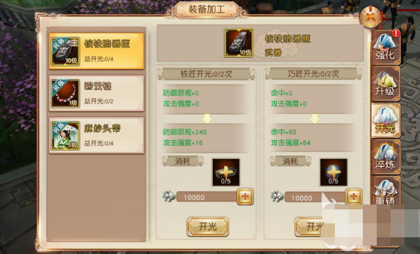 奉献装备会消耗相应的奉献材料。开光材料有两种方法。成功后可以分别增加装备的属性。玩家可以选择重铸不想使用的装备,重铸后可以返还相应的图纸和材料。装备重铸后,成为绑定装备,不能再上架出售。
