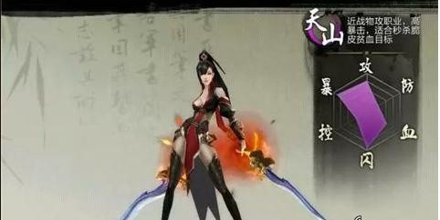 天山是高暴击职业,必然是最强后期,有着最高的暴击和爆伤加成。天山的技能是:隐身、飞来飞去(群攻),突刺三刀、生死符(禁技能释放)以及雪花六神(加速、增加闪避)、移花接木(快速到敌人身边缠绕)