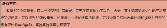 收集600个荣誉卡,可以兑换艾尔利克蛋蛋,每天在没有体力了以后,去做“亚比知识知多少”的三次高级知识问答,可以得到30张收集卡,如果想进一步加快取得速度,可以做每日亚比收集计划和视能力而定的稀有亚比收集的奖励,坚持坚持就可以获取了。