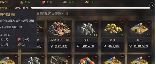 提升城内战争大厅建筑等级,每天可以通过掠夺获得大量资源,可以夺取资源上限和战争大厅等级相关,每天0点重置。
