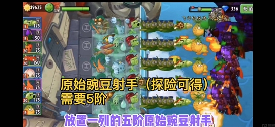4、而在甲板上,因为格子非常的稀缺,建议大家在甲板上的右起第一列放置一列的五阶原始豌豆射手。
