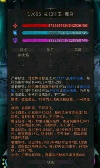 本图大部分BOSS的基础是被动30%血以下,每秒为全体附加一层自愈,每层每秒恢复1%血量。怕打不过或者练度低的第一时间前往不冻泉,在那里可以获得虹光祝福效果,50%治疗增益和5冰抗。(好像打一个副本要重新获取一次)。