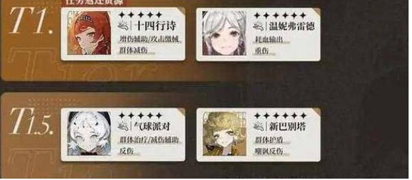 T1.5:Apple(单体治疗/群体回血)、雾行者(减伤/单体输出)、夏利(单体输出/反制驱散/群体增益)