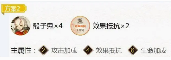 答:共有两种方案,第一种选择狰套加效果抵抗套,第二种选择骰子鬼套加效果抵抗套。式神属性介绍: