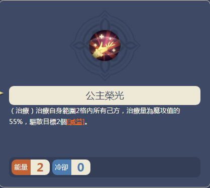 公主的荣光:治疗范围内友军,驱散2个debuff。如果队伍中只有伊南娜单奶妈的情况下,选择治疗技能可以提升队伍的续航能力。