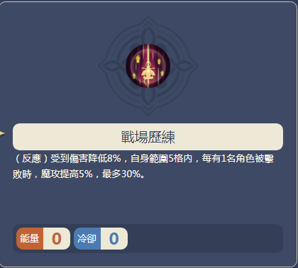 战场历练:受到伤害降低,自身范围5格内每有1名角色被击败,魔攻提升。