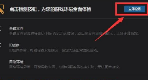 3、在cf游戏修复里,点击立即检查,等待完毕,可能是关键文件,IE缓存和网络环境的原因。