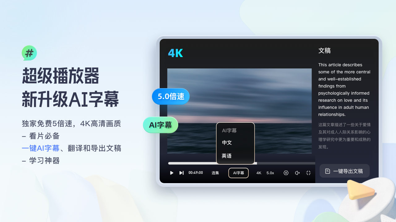 最高支持4K高清画质,屏幕能支持多高清,播放器体验就有多清晰;还有高阶配置,支持多音轨和多字幕;倍速0.5-5随心调,高效学习还免费