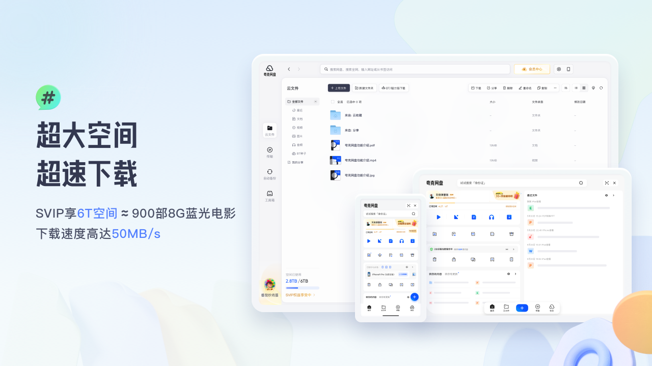 大文件下载再也不用等,日常转发的课件资料、办公软件,随用随下;还支持解析磁力链和BT种子,大文件一件存网盘