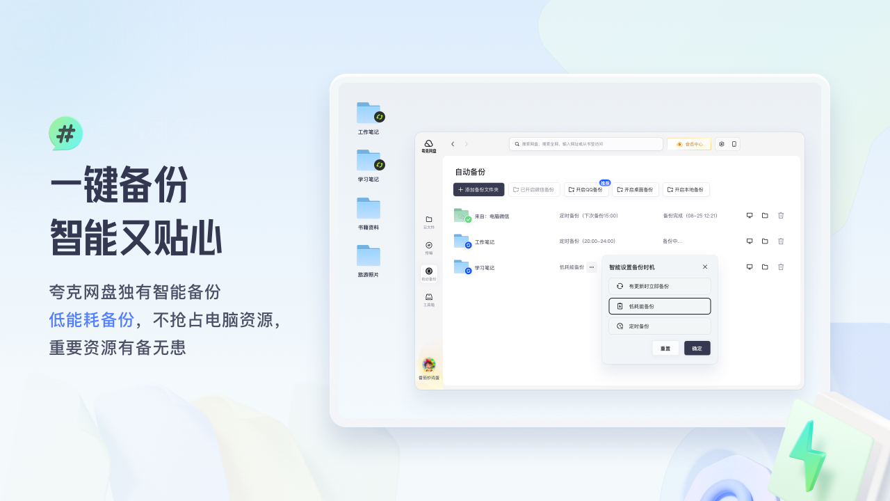 登录夸克网盘开启备份,支持微信/QQ/桌面/文档/下载,备份和指定文件夹备份,夸克网盘独有三种智能备份模式,低耗能不卡顿。