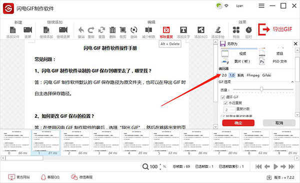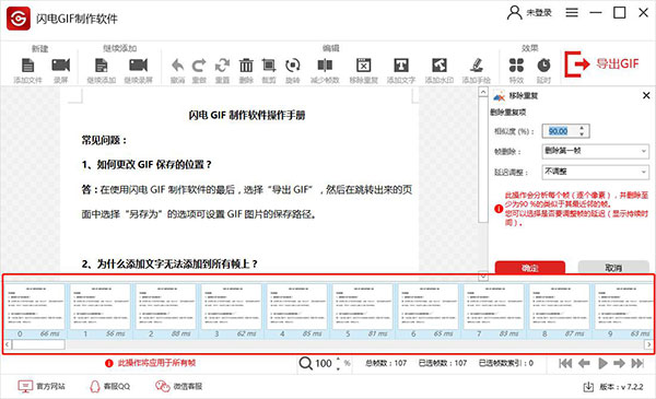 通过时间线逐帧编辑,支持对帧进行删除、翻转、移动、延时、重新排列等一系列操作