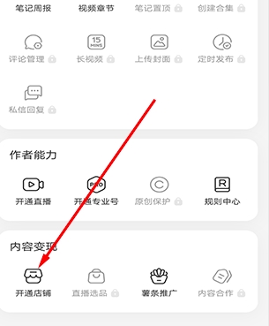 4、在创作中心页面里,找到内容变现-开通店铺;