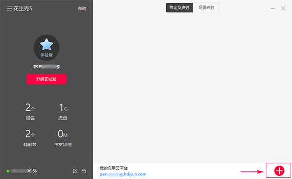 1、花生壳帐号登录成功后即可进入主界面。5客户端同时支持在客户端和网页端添加、修改和删除映射。点击客户端界面右下角“+”,进行添加映射;
