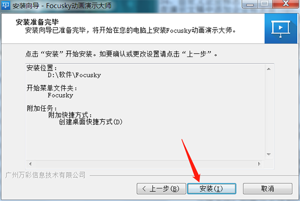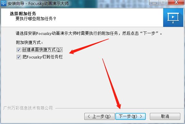 4、在选择附加执行任务,选择安装Focusky动画演示大师需要执行的附加任务,然后点击“下一步”;