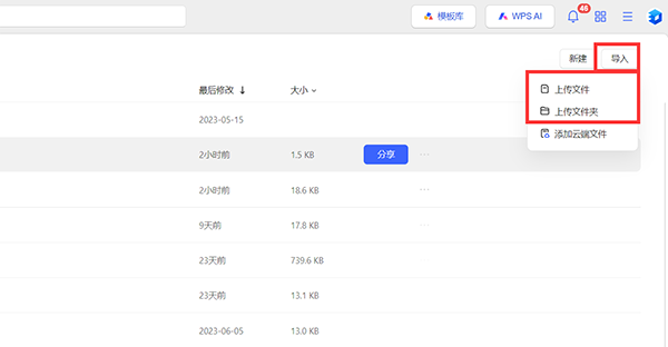 点击[我的文档],进入到想要上传的目录,点击右上角的[导入] 选择[上传文件]或上传文件夹],再选择需要上传的文档或文件夹即可