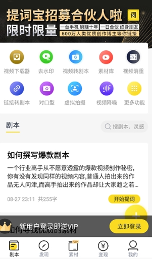 2、来到剧本页上面有许多功能使用,下面剧本题词功能可以帮你提取文章中优秀的关键词;