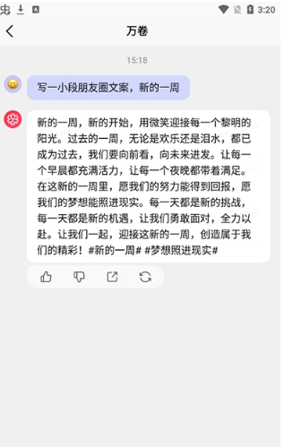 3、我们点击聊天框,比如要它写一段朋友圈文案“新的一周”就会立即生成,如果不满意还可以刷新重新生成;