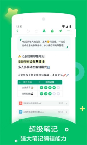 印象笔记app安卓版非常好用的一款办公工具,首先它有很多功能可以使用,非常丰富的实用功能,可以去满足各位用户的需求,包括学生可以去使用,提高大家的工作效率和节省时间,可以去养成一个非常好的习惯,非常不错的一款笔记工具,很多人都在使用的,你可以根据自己的计划进行,同时你可以去更改,软件非常大好处,可以让你的成绩不断的提高,非常有用的,喜欢的朋友快来下载体验吧!