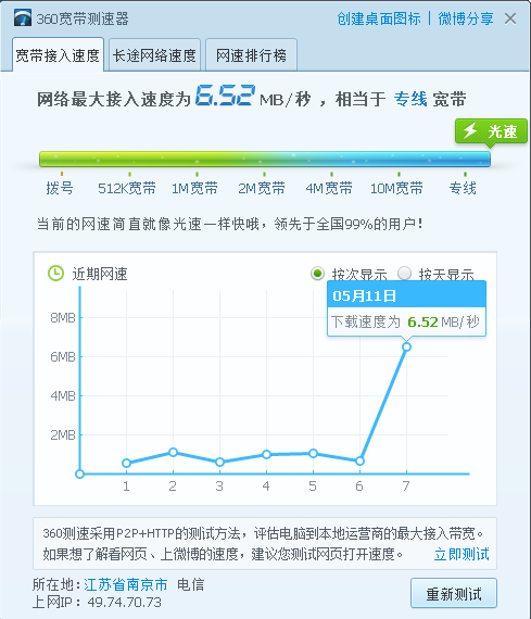 360宽带测速器测试宽带接入速度采用P2P+HTTP的测试方法,评估电脑到本地运营商的最大接入带宽。