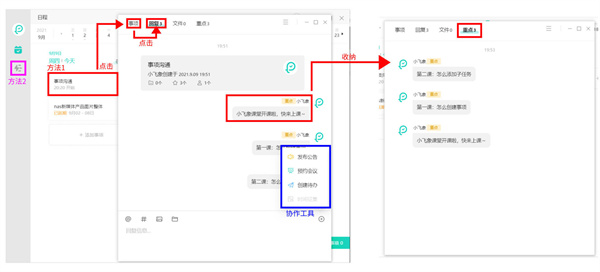 在进行事项沟通时,除可以针对沟通的内容标记【重点】外,我们还可以使用【发布公告】、【创建待办】、【预约会议】等协作小工具来处理事项的衍生事务~