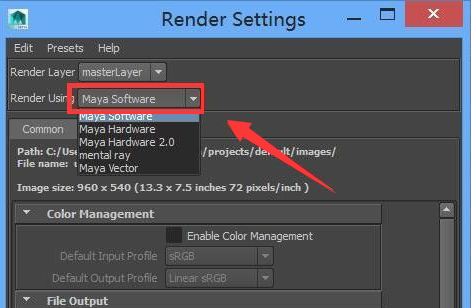 6、选择硬件渲染,将Render Using设置为:Maya Hardware;