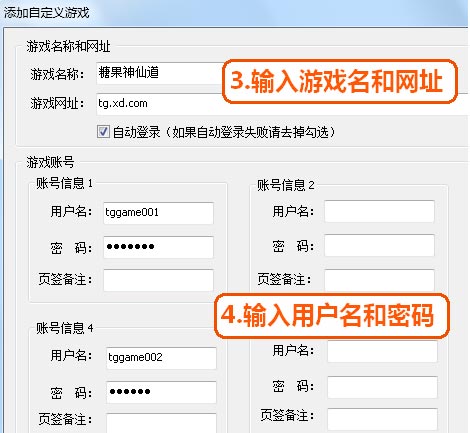 2、在弹出的对话框中,输入游戏名称和网址,然后输入用户名和密码,最后点击确定按钮即可添加到”我的游戏“中。