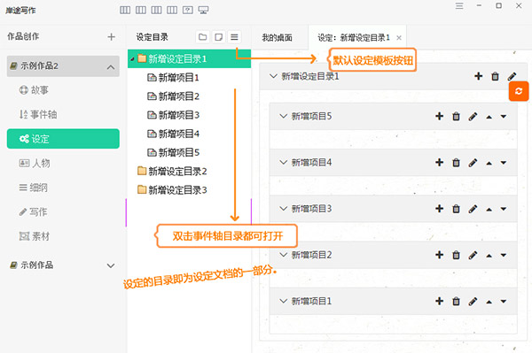 设定文档提供关于作品的相关设定的管理。设定最多提供三级设定,系统还提供了系统默认模板。