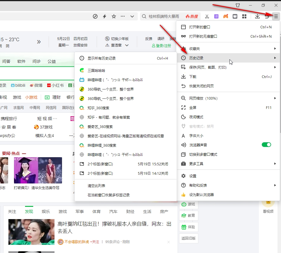 1、打开在本站下载的360极速浏览器,打开软件后点击右上角的三个横杠图标。
